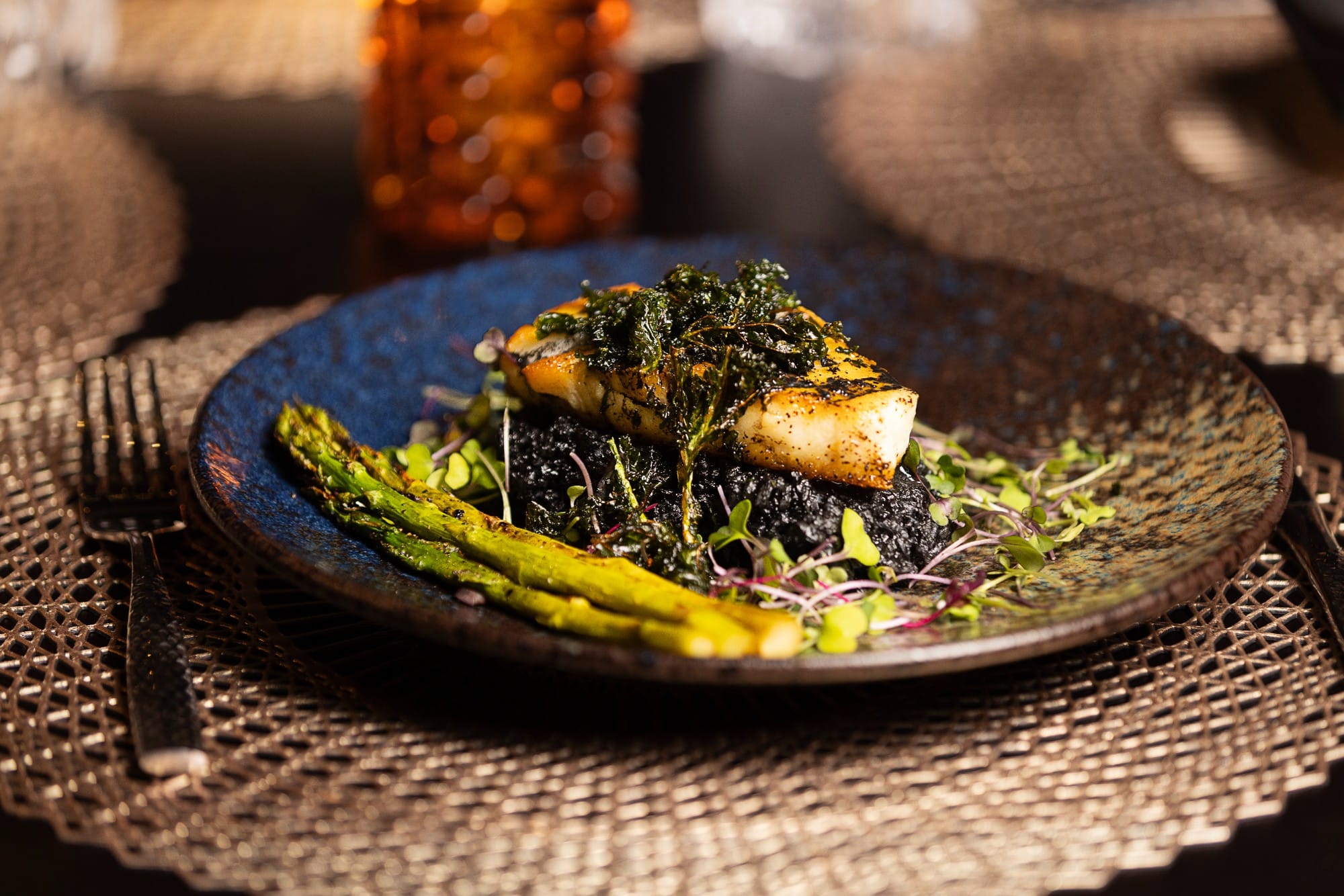 Sea bass 6oz, black rice, Kraken sauce, asparagus, fried parsley, microgreens.