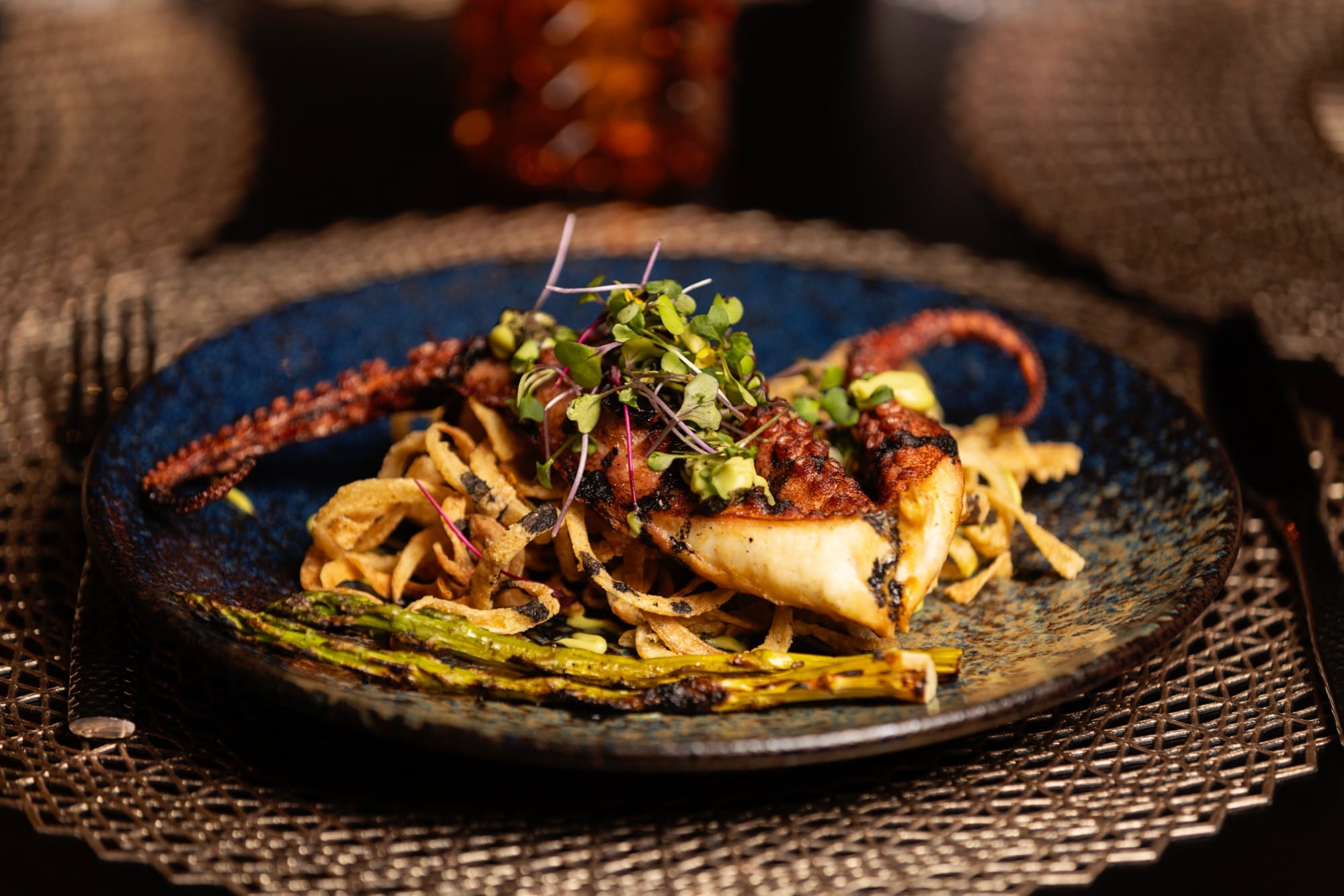 Octopus 7oz, Fried Potato, Avocado Green Sauce, Kraken Sauce, Asparagus & Microgreens