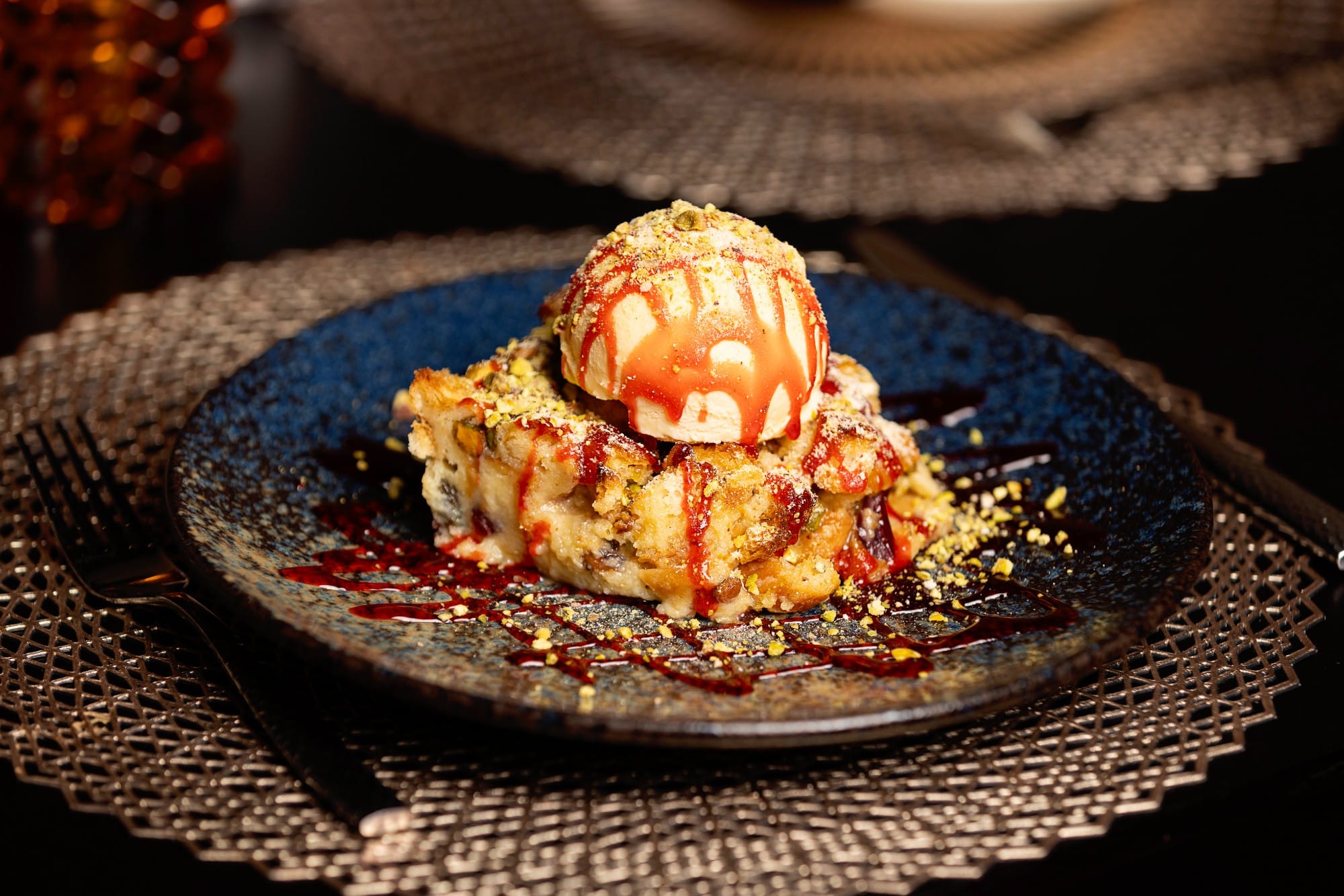 Pistachios, Butter, Caramel Sauce, Vanilla Ice Cream & Toasted Almonds