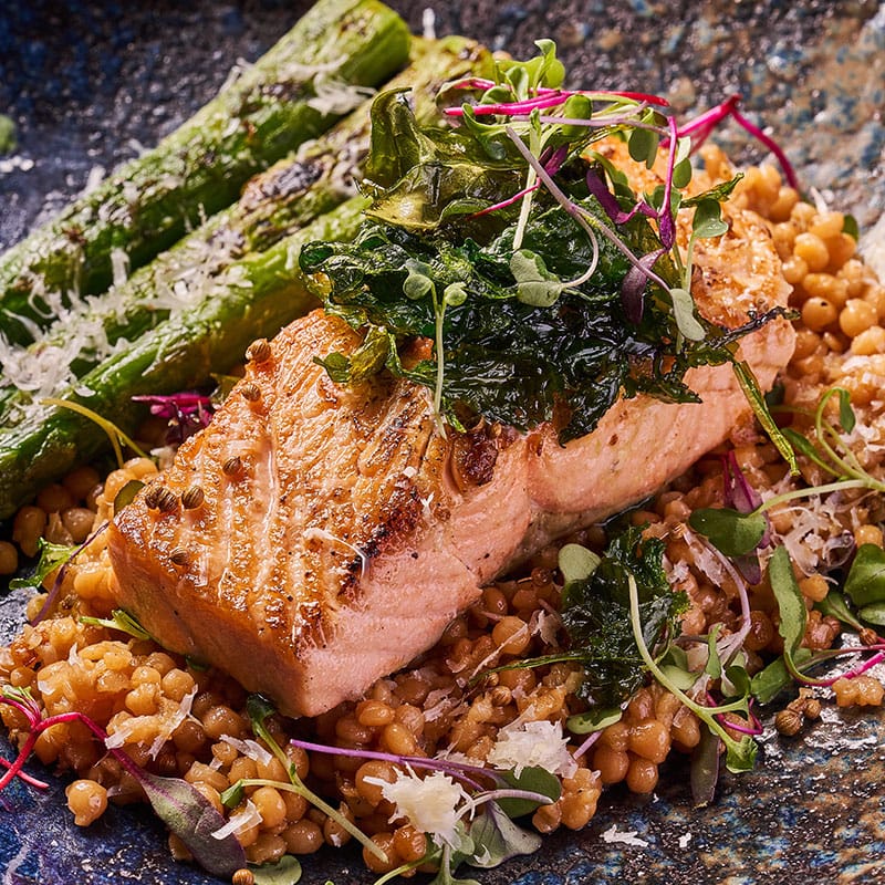 Salmon 6oz, Mexican-style couscous, asparagus, parmesan cheese, fried parsley.