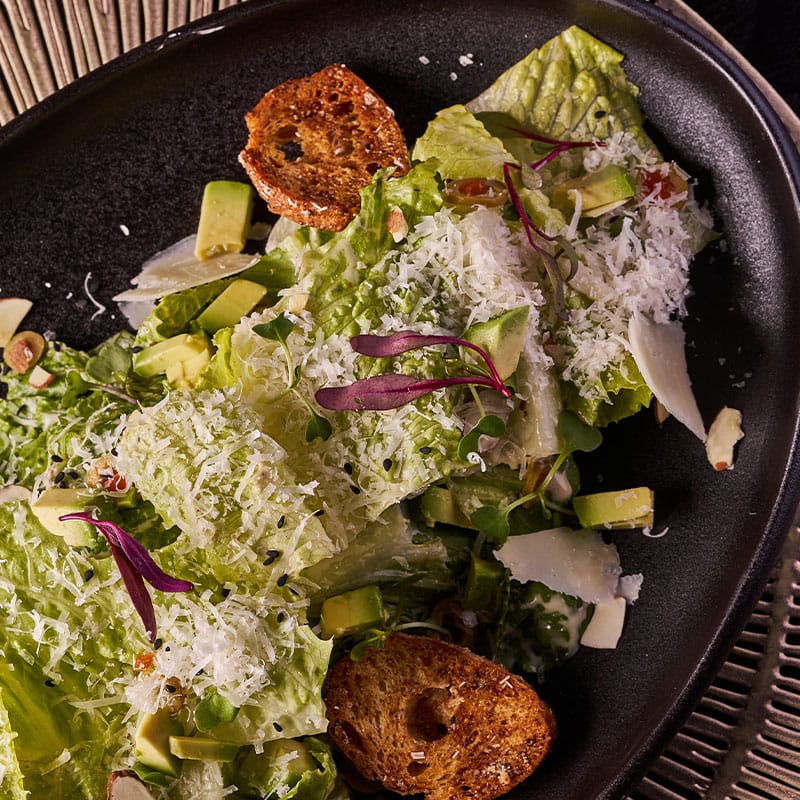 Romaine lettuce, croutons, parmesan cheese, anchovies, olive oil, avocado, and pistachio.
